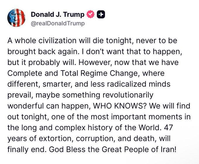 Trump clarified his threats to say that every bridge and power plant will be destroyed, saying that he did not want to do that, and offering to rebuild Iran. He then said that the destruction he would inflict would take one hundred years to rebuild.