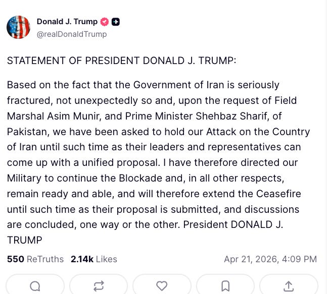American President Donald Trump had a choice between delay, making a deal, and escalation. As we have previously said, making a deal would confirm Iran as a regional hegemon. Rather than escalate as we expected, Trump has chosen to buy time. He unilaterally extended the ceasefire with Iran indefinitely, while keeping Hormuz closed. As occurred with the original ceasefire, he attributed this to a request from Pakistan. It had been revealed that the original ceasefire request from Pakistan had been drafted by the Americans, and we do not believe that in this case it was Pakistan’s request that led to the ceasefire’s extension.